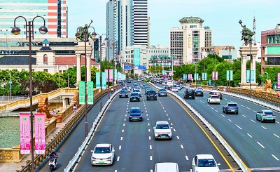 天津市大光明桥附近沿街悬挂上海合作组织峰会道旗,迎接“上合时刻”。新华社发